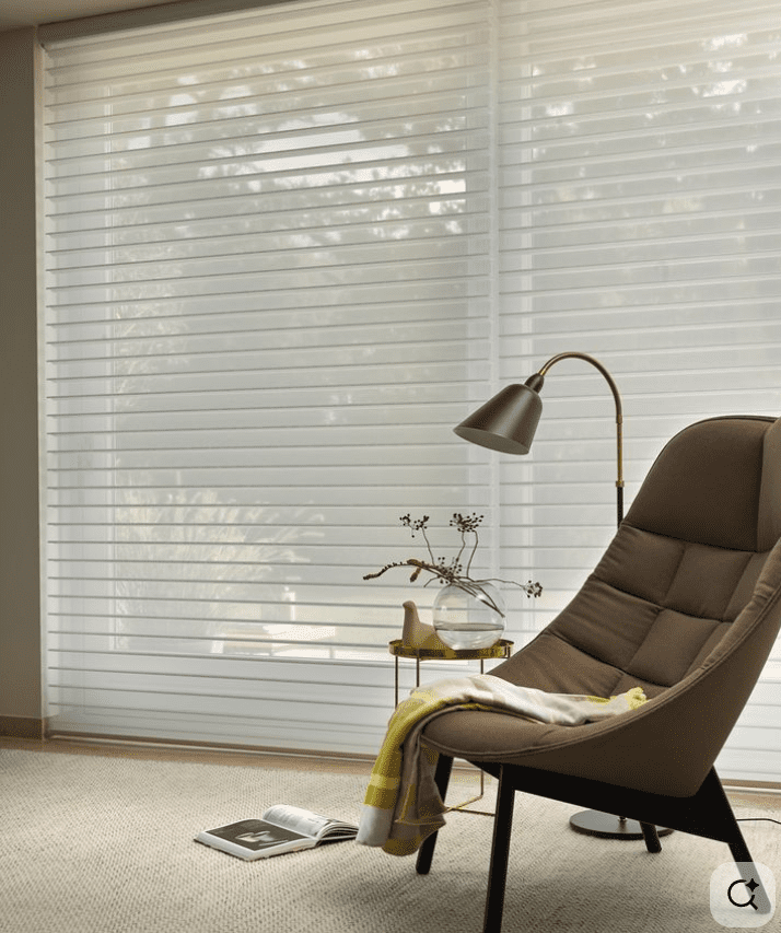 Cortinas Sheer Casabela, um lançamento diferenciado, com lâminas de tecido suspensas entre duas telas transparentes que flutuam no ar, dando mais suavidade e leveza ao ambiente, em linhas retas horizontais, sem cordas ou cintas aparentes.