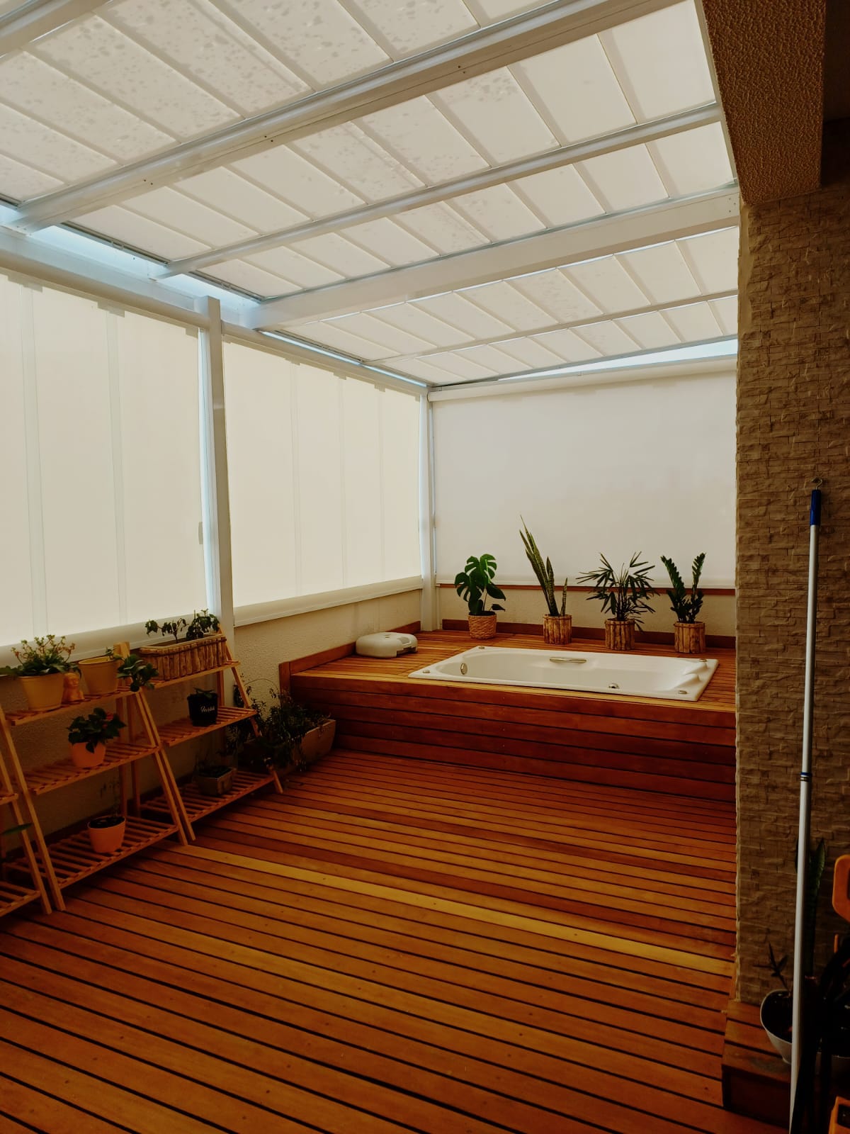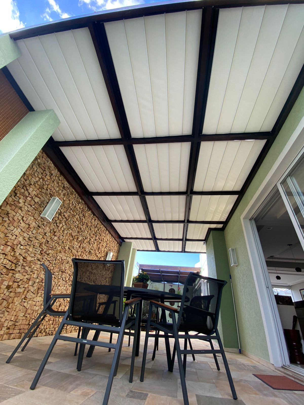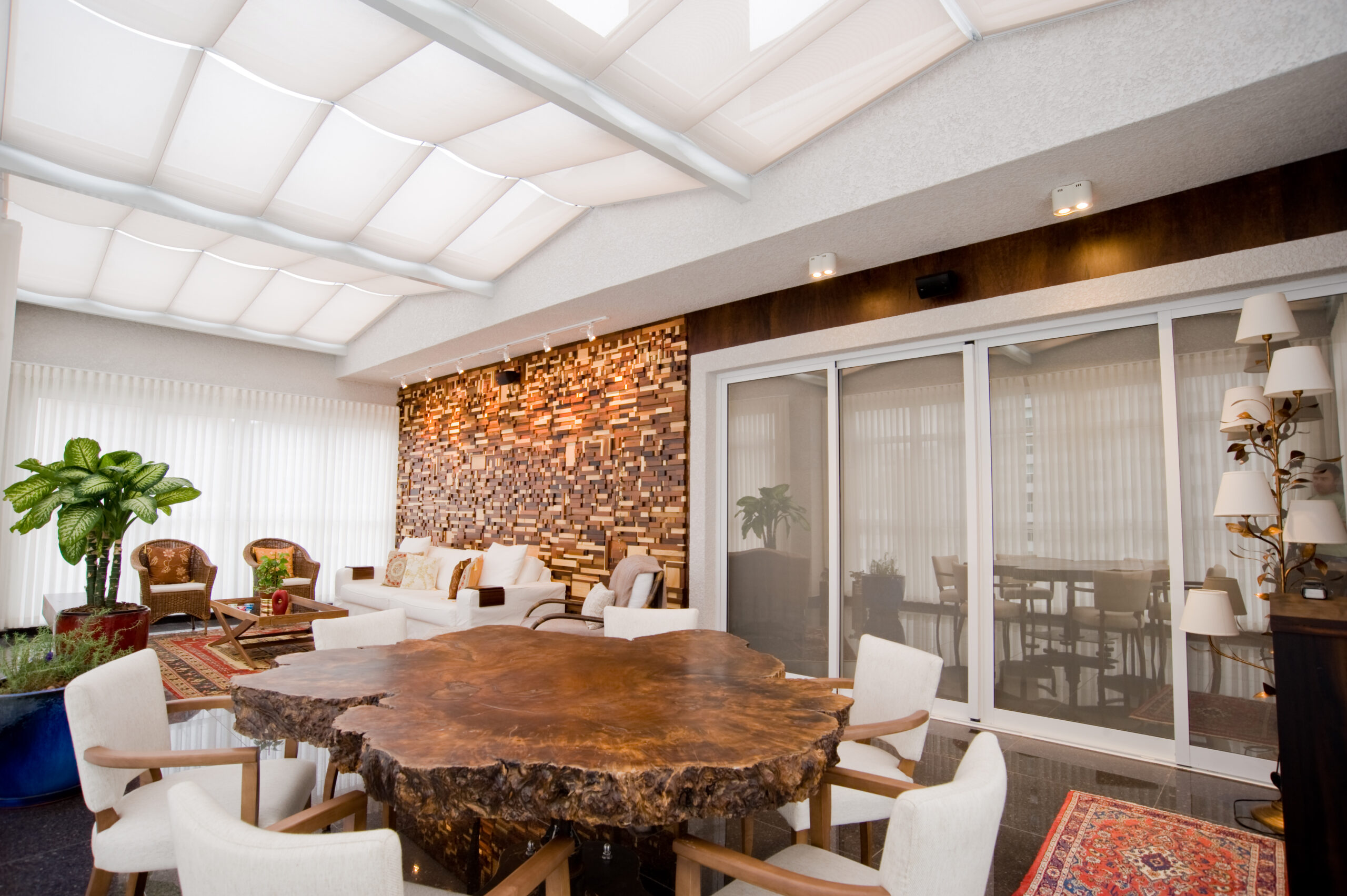 Ambientalize sua cobertura de vidro, sem tirar a luminosidade e translucidez. Perfeito para estruturas envidraçadas hoje muito utilizadas em residências de alto padrão. O vidro é um forte condutor de energia calórica, mas com a Sky Light instalada junto à essas estruturas, há uma redução de até 96% da energia solar, os raios Ultravioleta e Infra-vermelho. Telas para proteção solar. (Termoscreen)